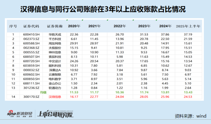 与13家同行可比公司相比,汉得信息账龄在3年以上的应收账款占比仅低于华胜天成,高于另外12家上市公司。wind显示,2020-2024年、2025年上半年,汉得信息13家同行可比公司3年以上账龄应收账款占比均值分别为11.53%、11.17%、10.36%、11.74%、13.81%、13.43%,比汉得信息同期数据少一半。