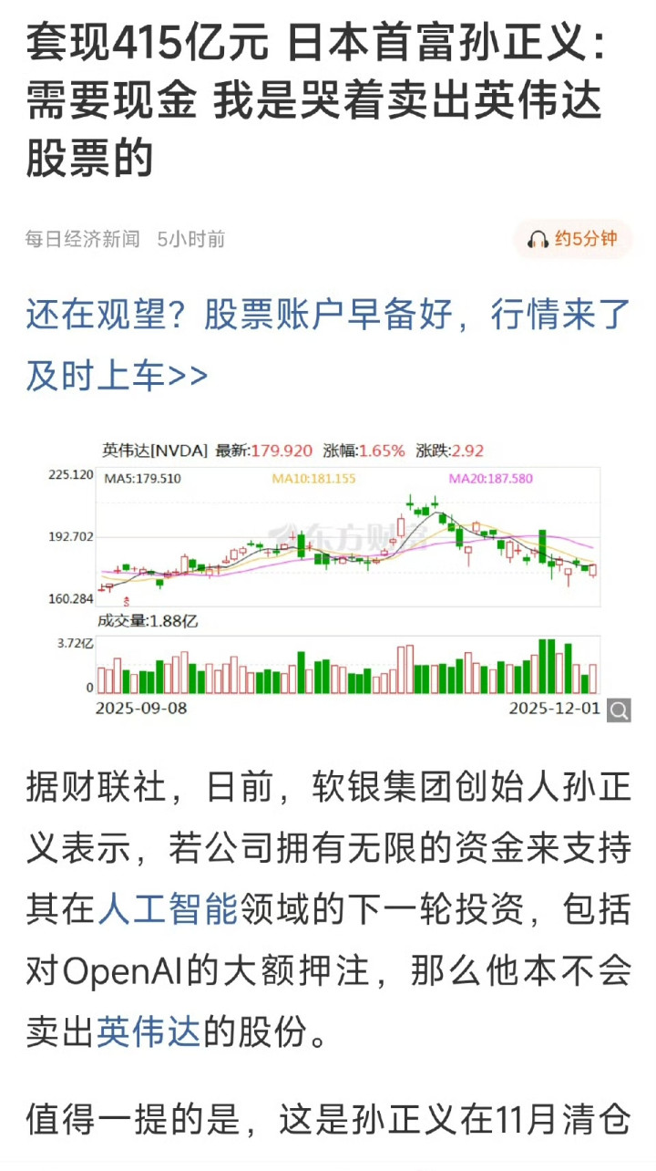 这笔交易发生在英伟达市值从4万亿美元飙升至5万亿美元之际。孙正义12月1日首度回应这一决定,表示如果软银有“无限的资金”,根本不会卖掉英伟达的股票。