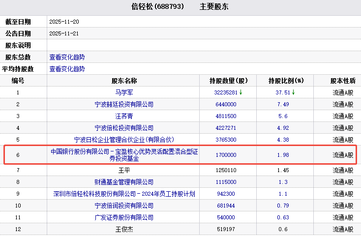 截至2025年11月20日,倍轻松主要股东中,中国银行股份有限公司-宝盈核心优势灵活配置混合型证券投资基金为第六大股东。